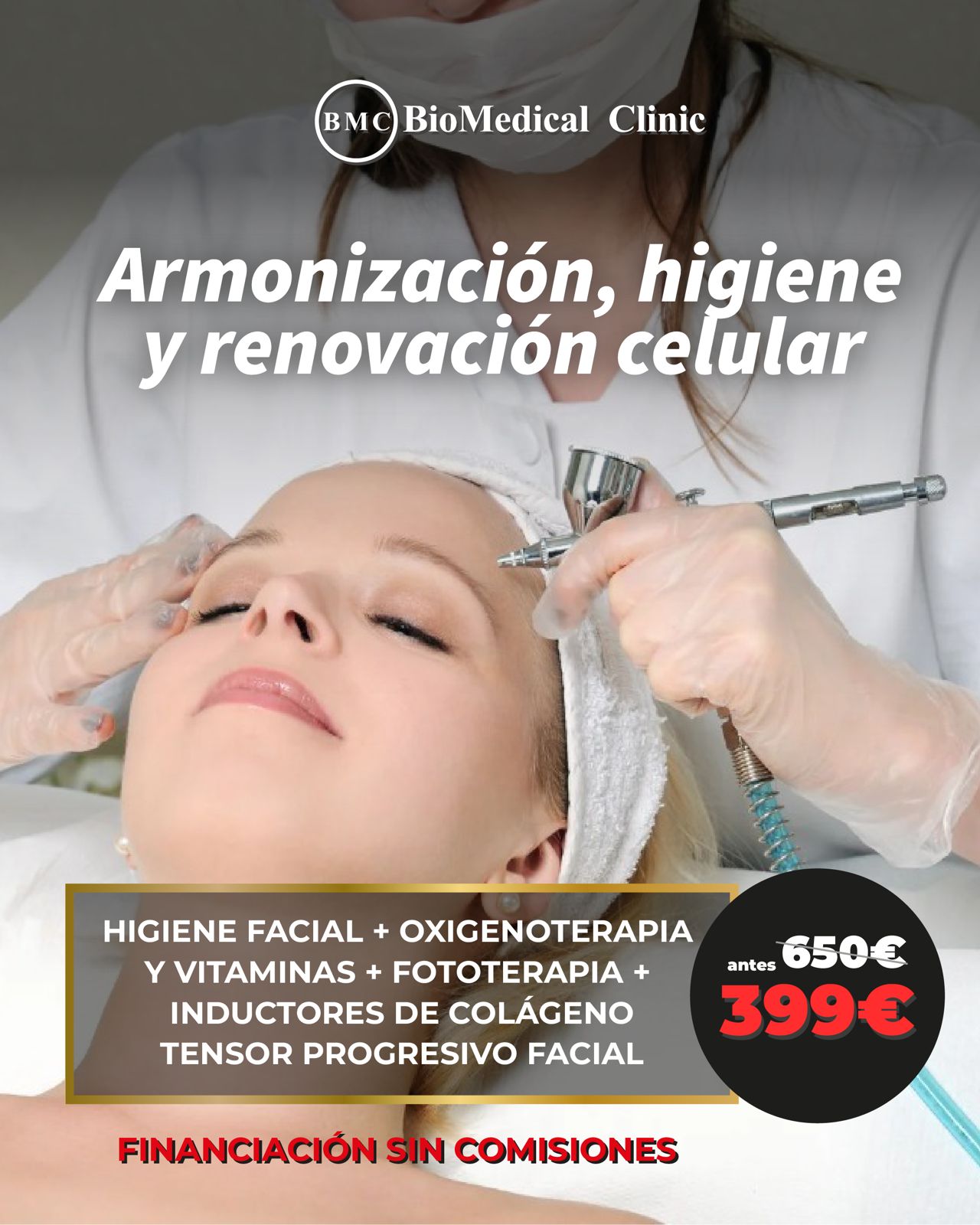 Tratamiento facial completo que combina higiene facial profunda, oxigenoterapia, vitaminas, fototerapia e inductores de colágeno para mejorar la calidad de la piel, estimular la regeneración celular y aportar un efecto tensor progresivo.